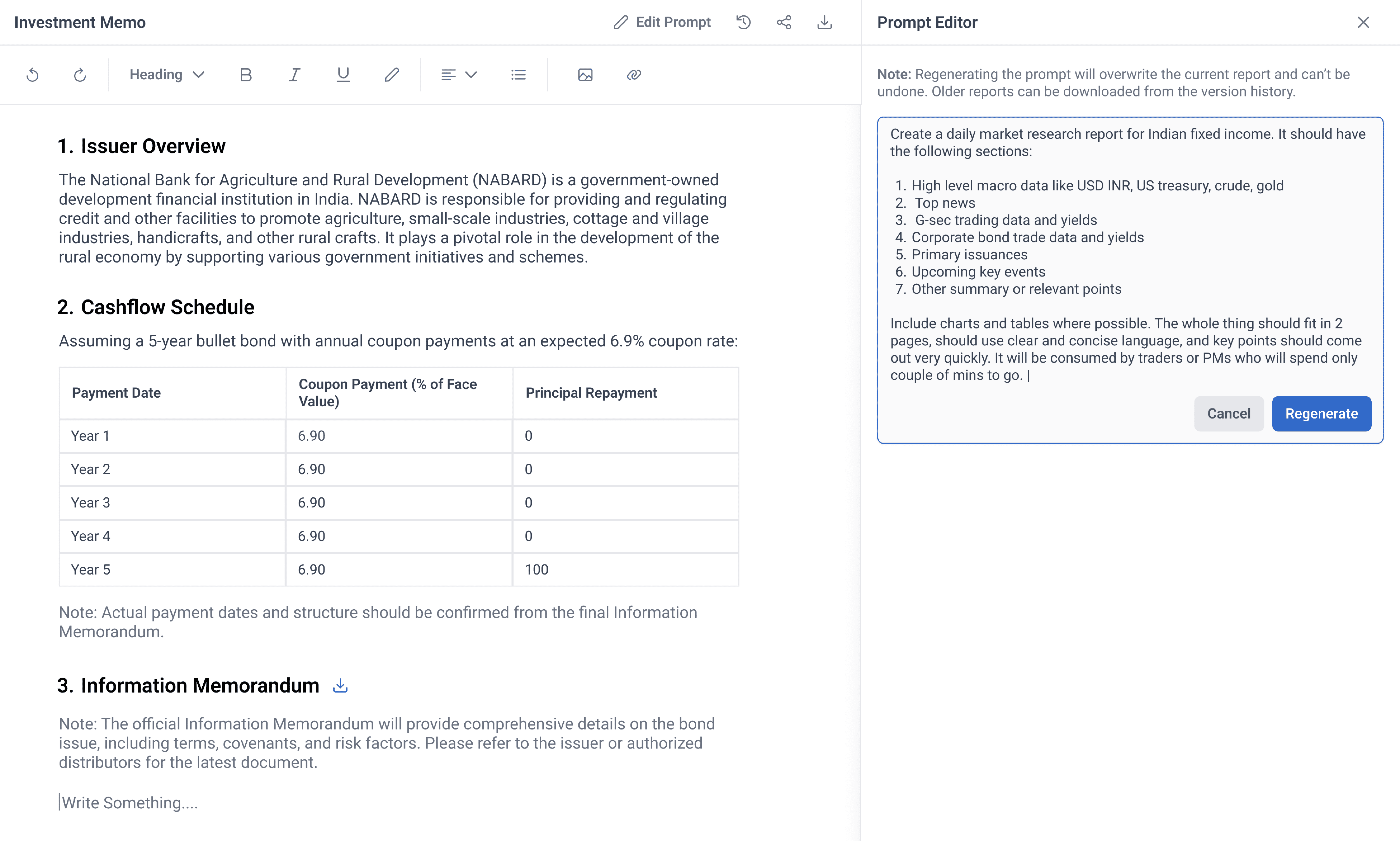 Investment memos, market briefs, and others